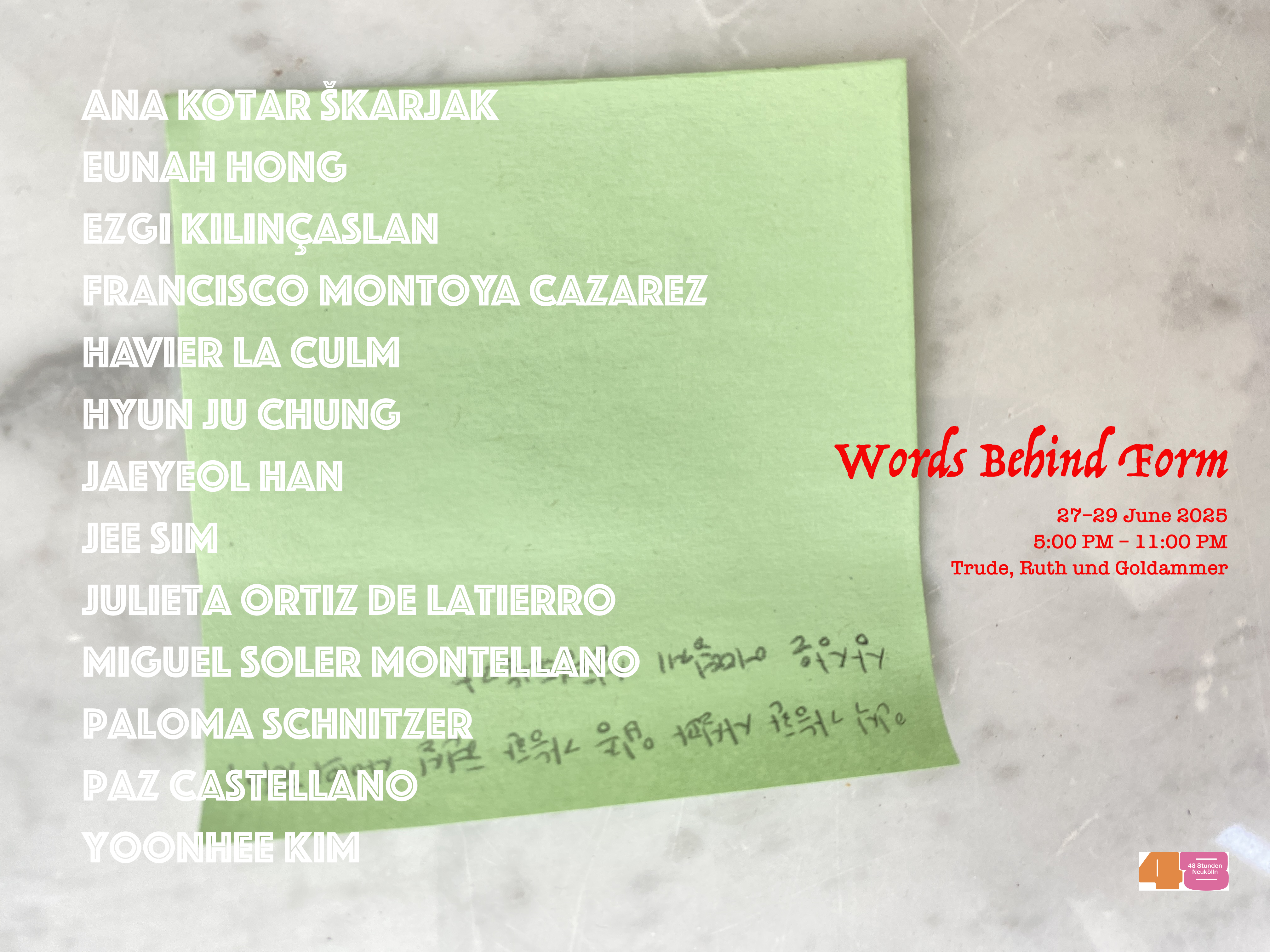Artists : Ana Kotar Škarjak, Eunah Hong, Ezgi Kılınçaslan, Francisco Montoya Cazarez, Havier La Culm, Hyun Ju Chung, Jaeyeol Han, Jee Sim, Julieta Ortiz De Latierro, Miguel Soler Montellano, Paloma Schnitzer, Paz Castellano, Yoonhee Kim