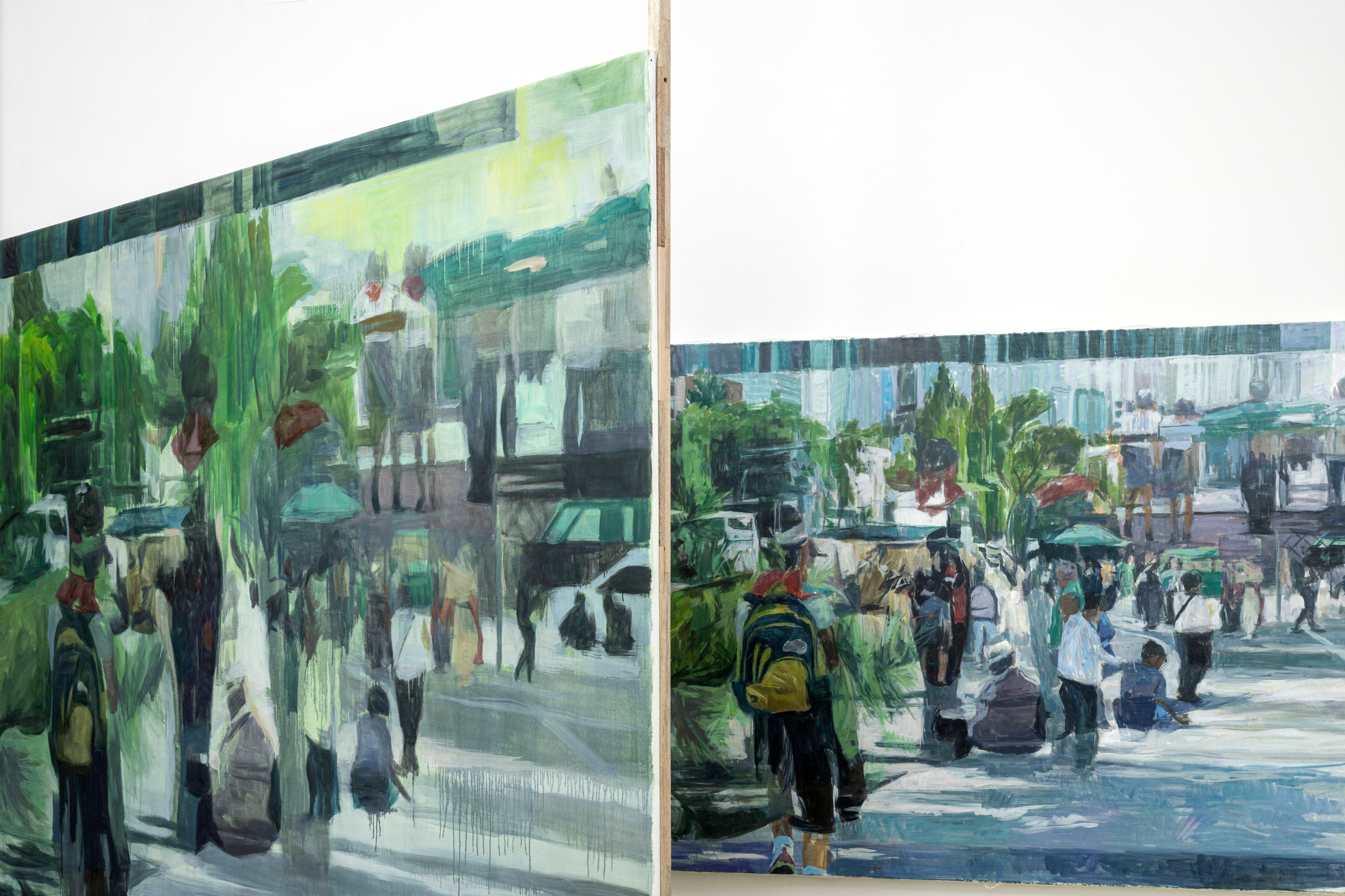 Real situations serve as the basis for new spatial constellations that do not occur in everyday life. The superimposition of several unrelated scenes serves to create a new social space. This newly created space becomes an unbounded body that dissolves social expectations and tensions. The foreshadowing that dwells within each image recedes and unexpected, real interstices emerge.